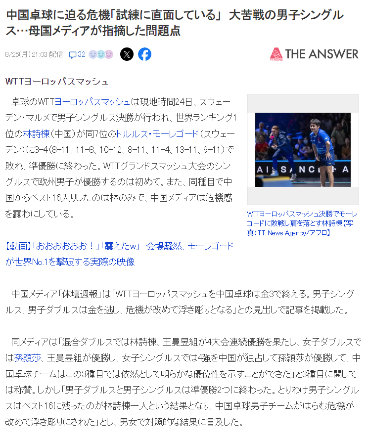 北京时间8月25日,日媒《The Answer》撰文中国乒乓球面临危机,男单项目面临巨大考验,中国媒体都指出症结所在。
