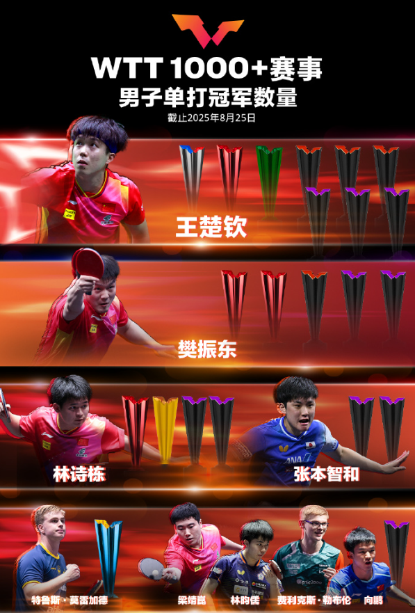 其实从这张图就能看出很多问题,WTT1000+赛事,只有林诗栋、樊振东、王楚钦三人有过多次冠军,梁靖崑、向鹏都只有1次,综合实力的差距的确相当明显。(张本智和都已经两次)