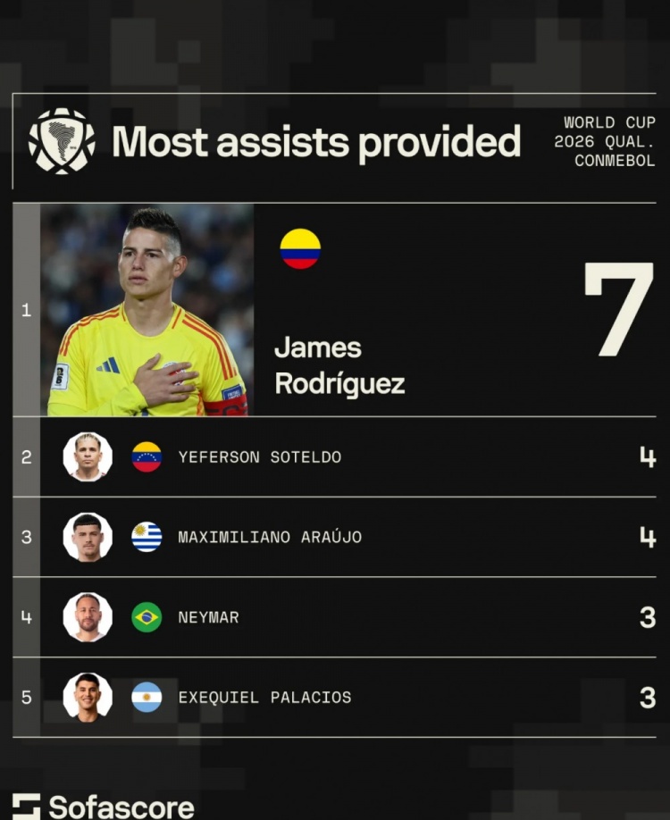 9月11日讯 本届南美世预赛结束,Sofascore统计了球员送出助攻的次数,J罗7助居首。