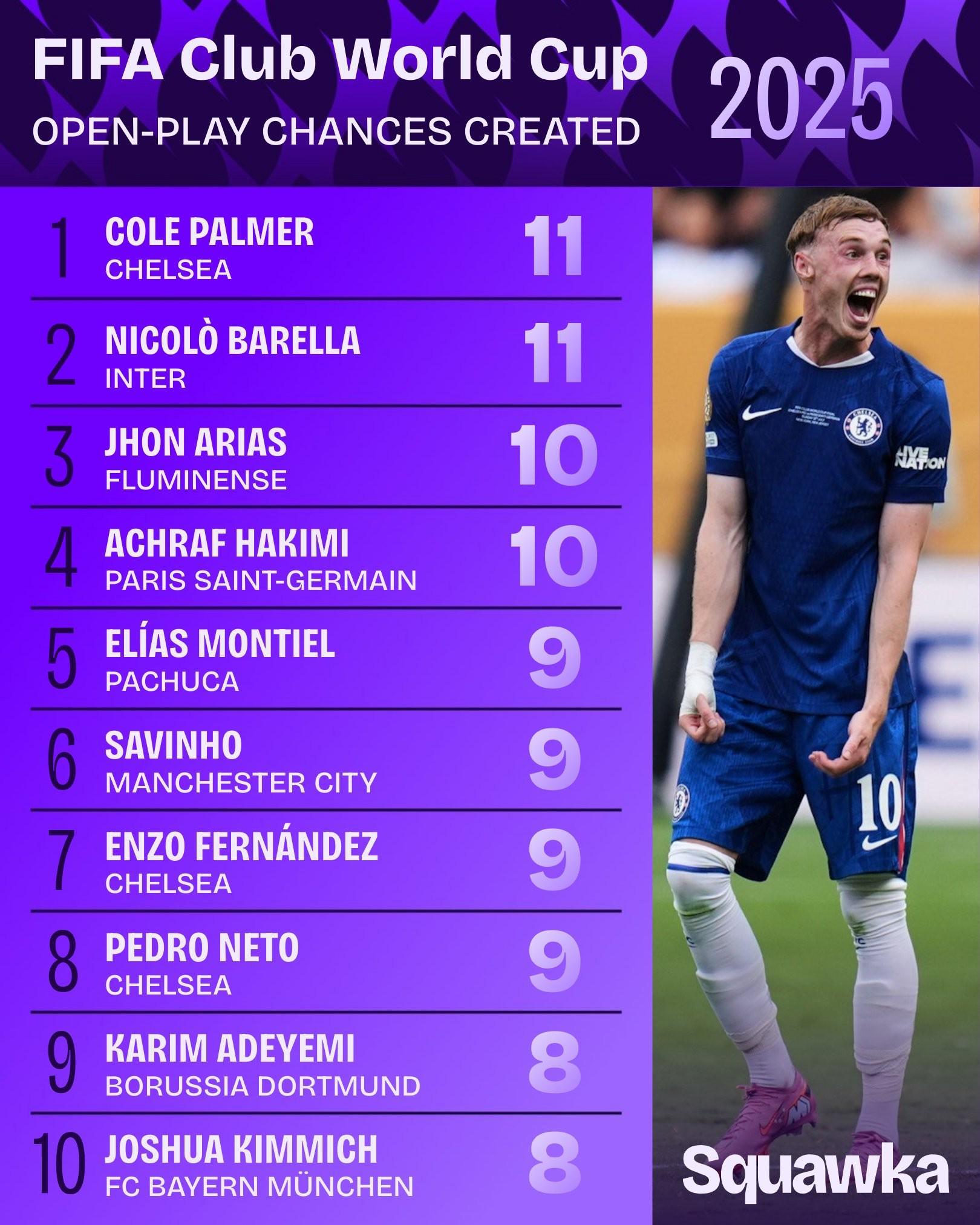 北京时间7月14日,在切尔西3-0击败巴黎圣日耳曼赢得本届世俱杯冠军之后,Squawka也统计出了本届赛事运动战创造机会次数排名前10的球员,决赛中完成梅开二度的帕尔默与国际米兰的巴雷拉同以11次并列第一。